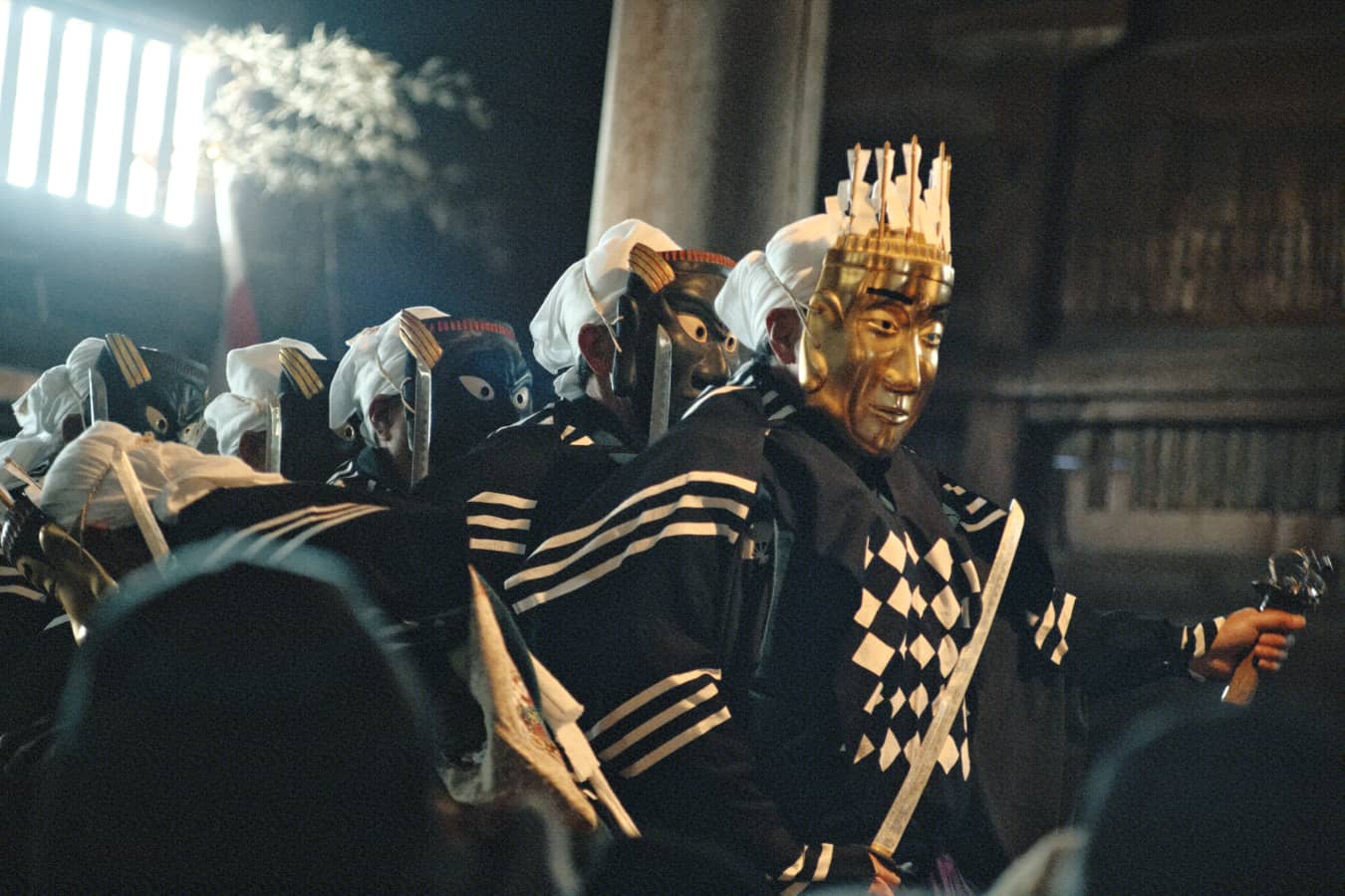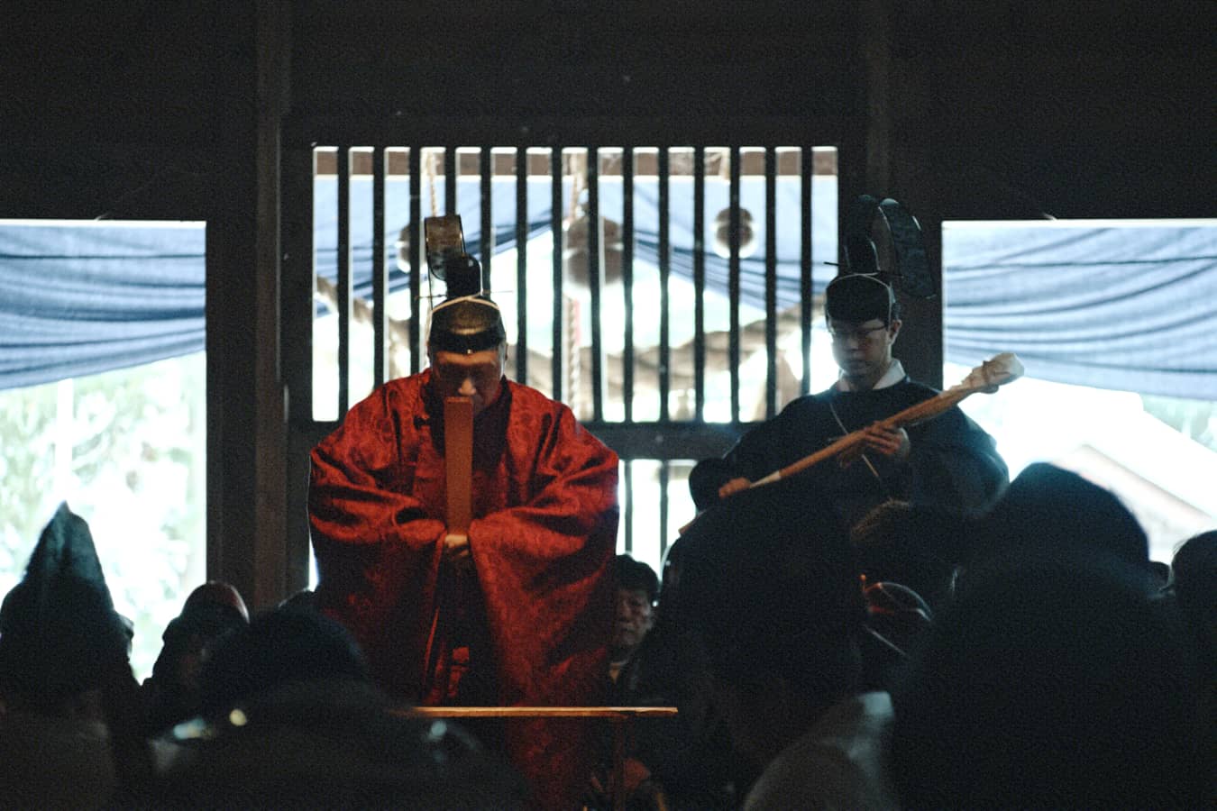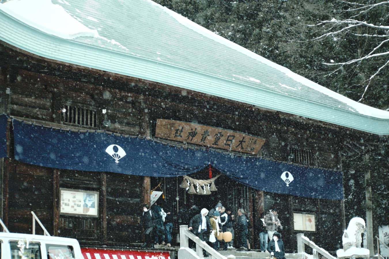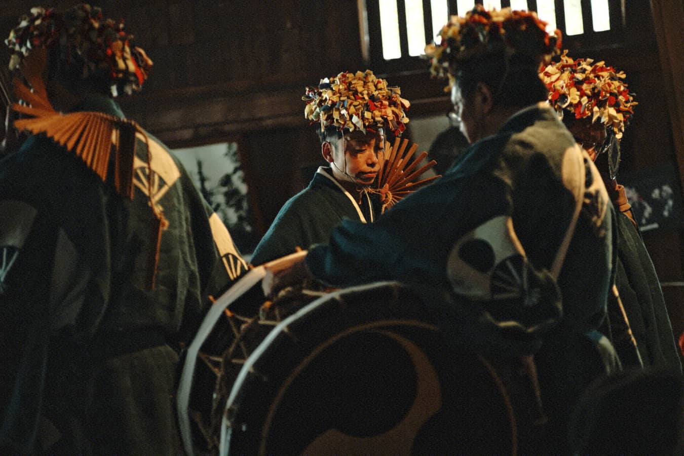 正月二日に当社の拝殿で行われる大日堂舞楽は、奈良時代の養老二年(七一八)に伝えられたものと言われ、四部落の能衆と呼ばれる舞人・楽人により行われます。